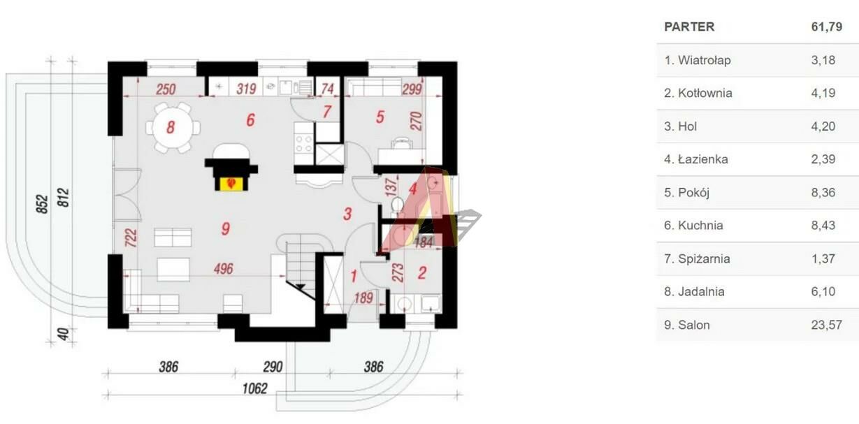 Na parterze znajduje się salon połączony z aneksem kuchennym oraz jadalnią , pokój łazienka oraz schody na piętro .
