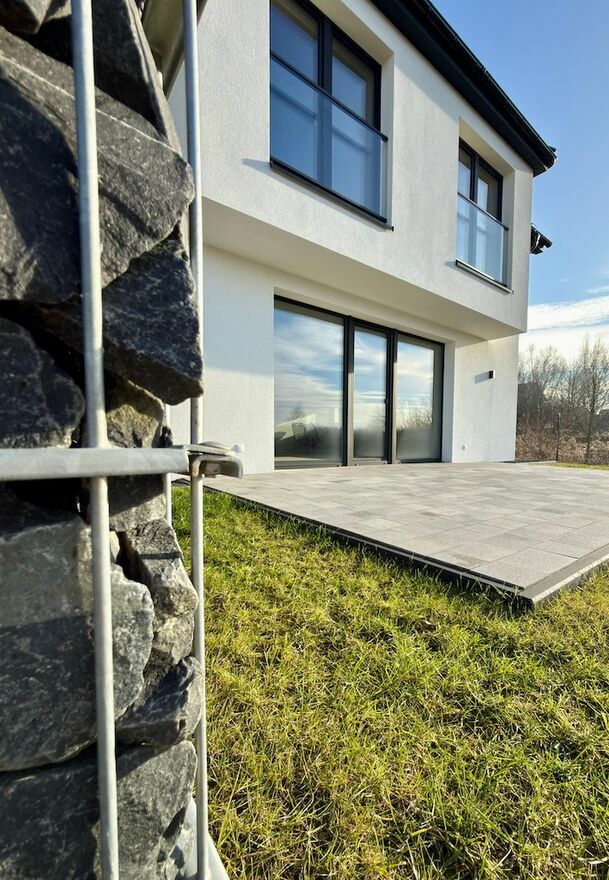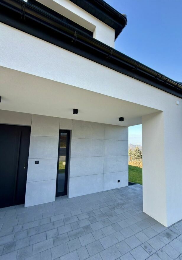 Elewacja: tynk silikonowy i ozdobne panele z betonu architektonicznego,